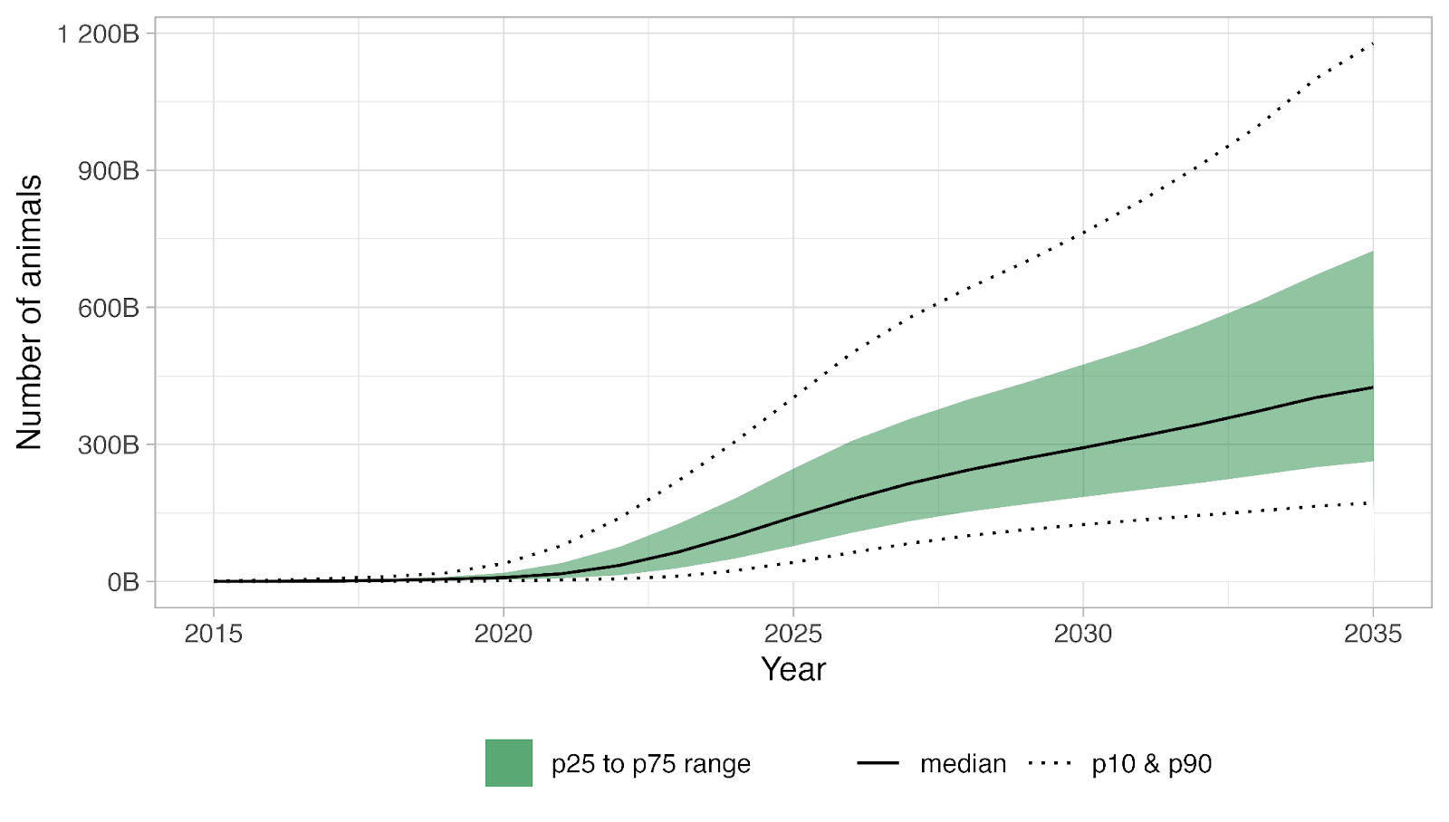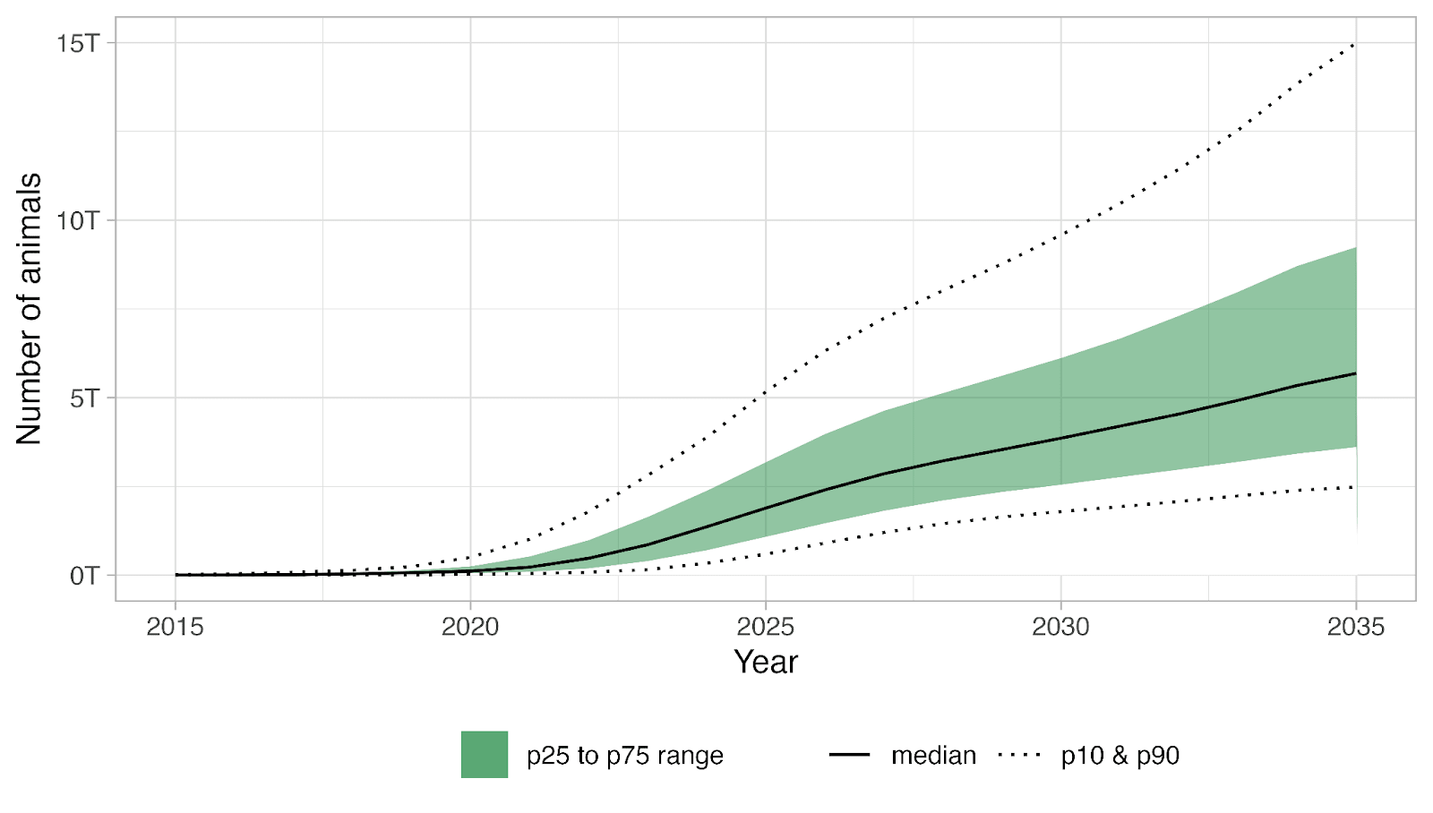 - Despite a more modest production outlook, the median scenario is still consistent with a very large number of insect larvae being farmed (293B at any time) and killed (3.9T annually) in 2030.