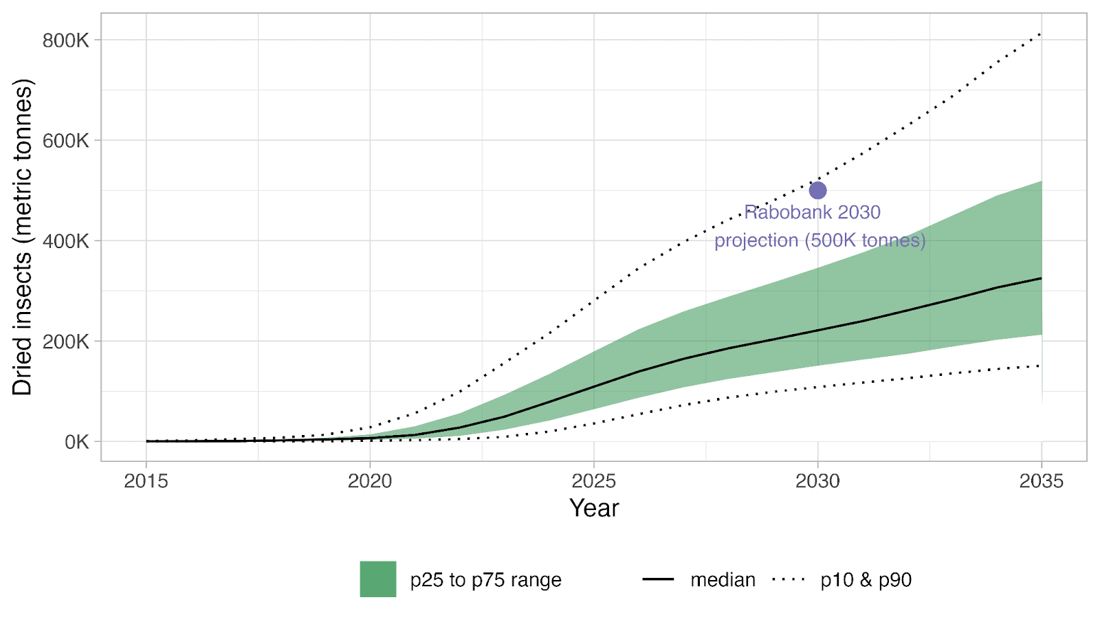 - The median model projection points to production capacity of 221K metric tonnes of dried insects by 2030, less than half of that predicted in an influential 2021 Rabobank report.