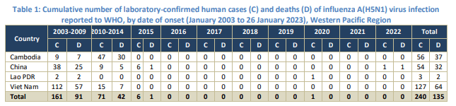 - H5N1 has popped up sporadically throughout the world, but not in simultaneous community spread characteristic of an oncoming pandemic. Per the WHO, "Globally, from January 2003 to 25 November 2022, there have been 868 cases of human infection with avian influenza A(H5N1) virus reported from 21 countries. Of these 868 cases, 457 were fatal (CFR of 53%)."