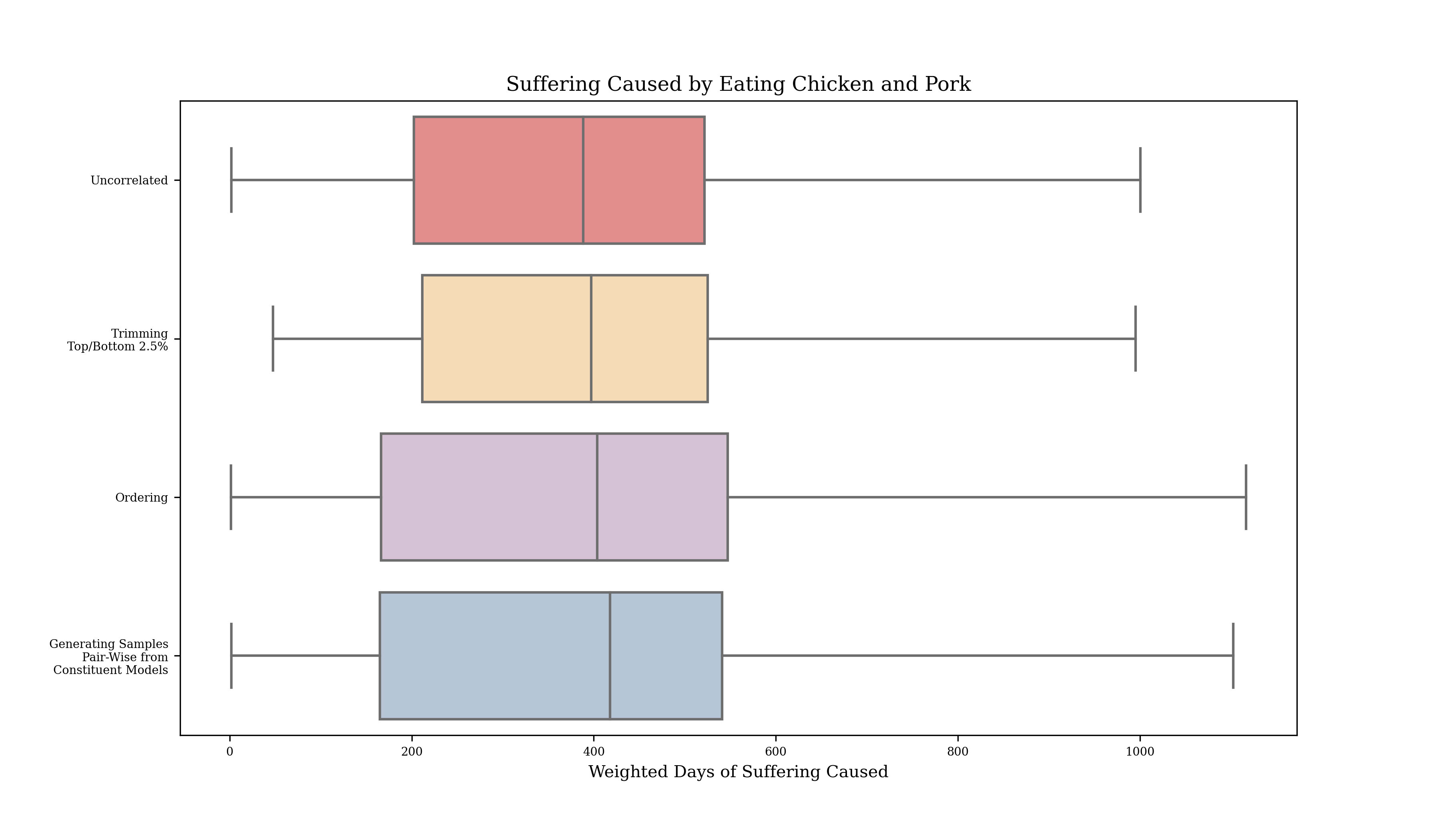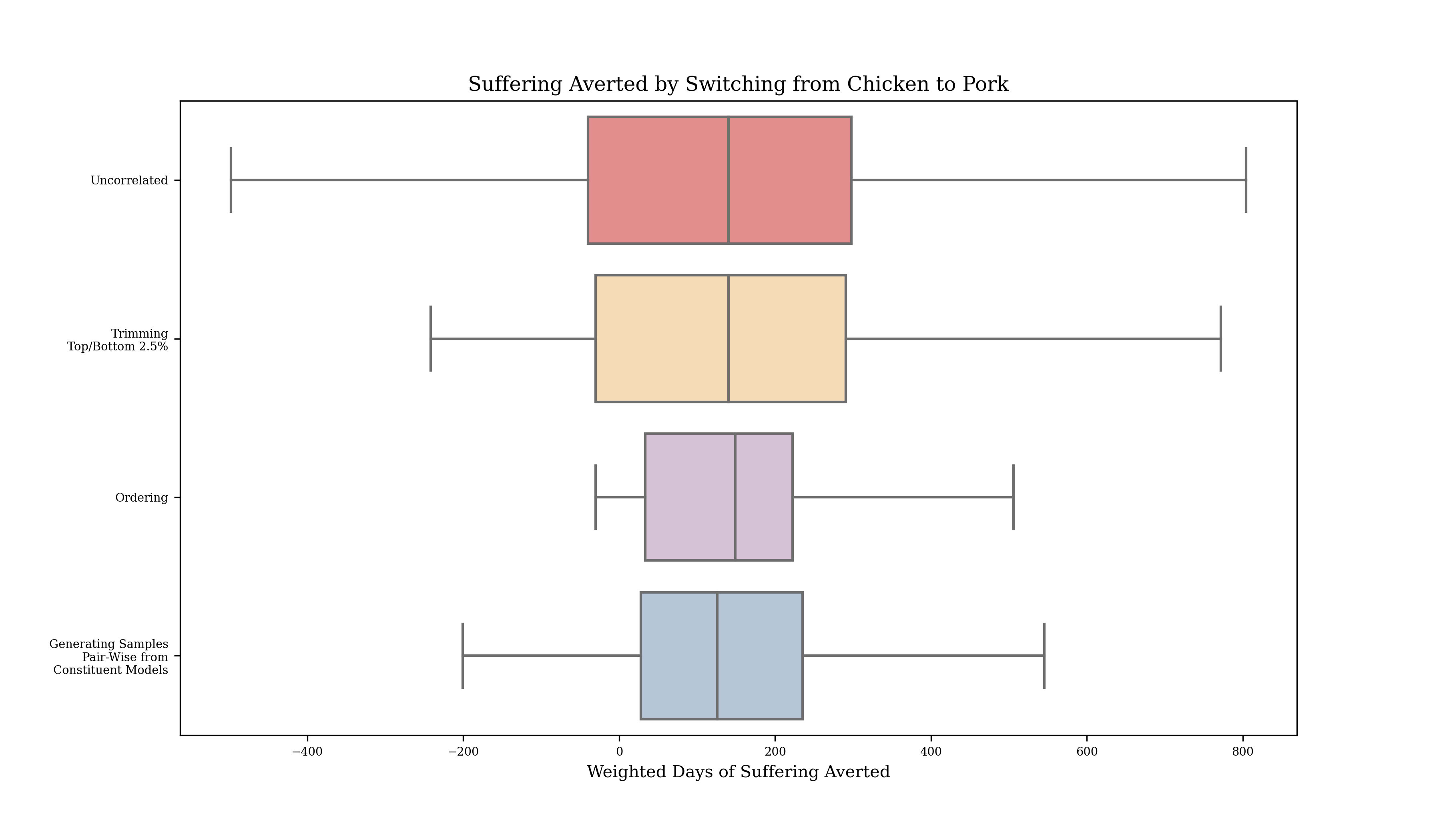 The symmetry assumption doesn’t matter for our welfare range estimates. Instead, it matters for estimates of the total number of DALY-equivalents averted. Suppose, for instance, that humans’ welfare range is 0 to 100 (on net, their welfare is always neutral or positive) whereas chickens’ welfare range is -9 to 1 (their welfare can be 9x worse than it can be good). Our estimate of chickens’ relative welfare range would be the same: 10%. However, such an asymmetry would obviously alter the amount of welfare represented by “25% of chickens’ negative welfare range” (0.225 DALYs per chicken per year on average vs. 0.025 DALYs per chicken per year on average). To make the implications clear, we’ve developed a farmed animal welfare cost-effectiveness BOTEC that allows users to input their own assumptions about the skews of animals’ welfare ranges to convert welfare changes into DALY-equivalents averted.