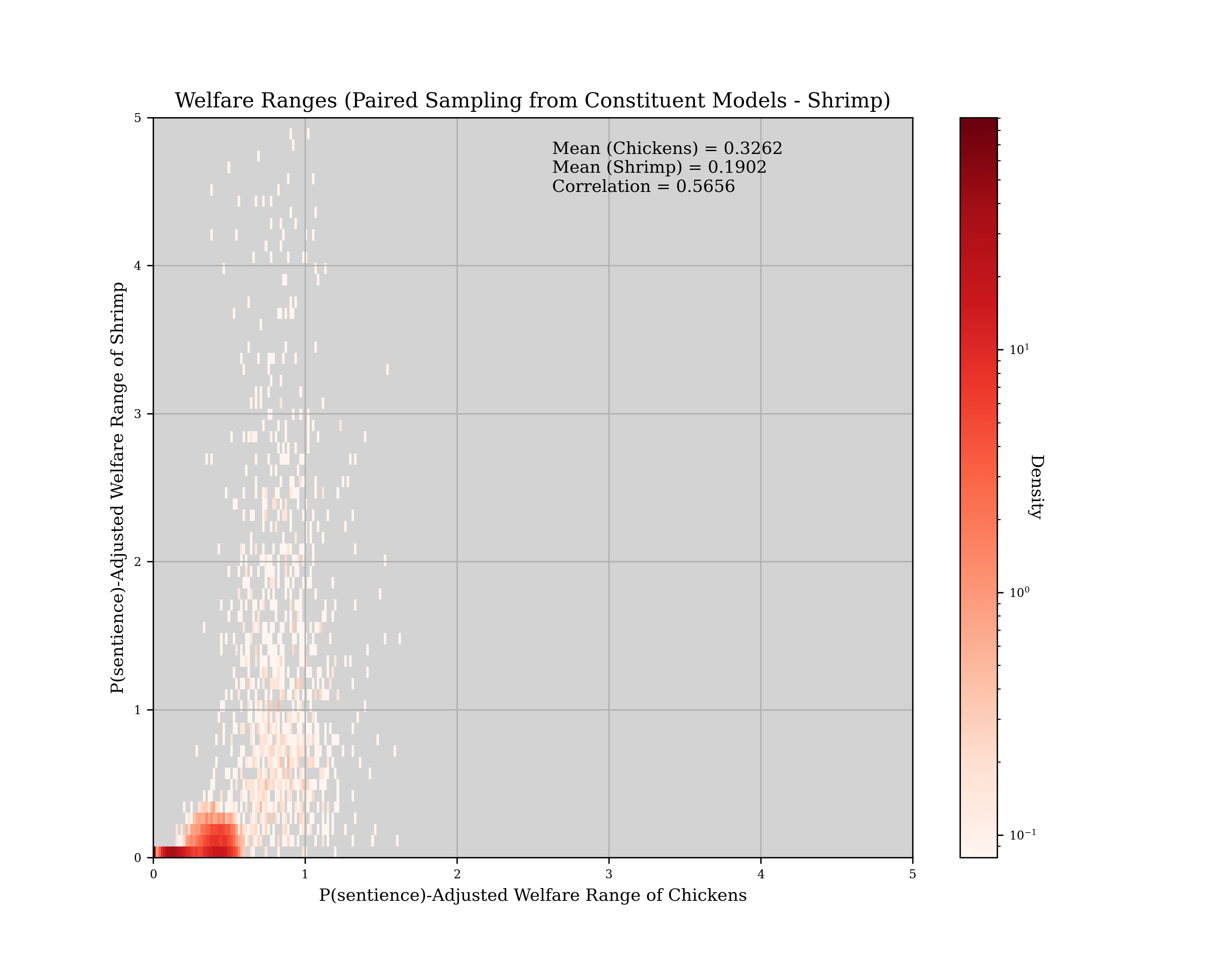 The probability of sentience is multiplied through here, right? Some of these animals are assigned <50% probability of sentience but have nonzero probability of sentience-adjusted welfare ranges at the median. Another way to present this would be to construct the random variable that's 0 if they're not sentient, and then equal to the random variable representing their moral weight conditional on sentience. This would be your actual distribution of welfare ranges for the animal, accounting for their probability of sentience. That being said, what you have now might be more useful to represent a range of expected moral weights for (approximately) risk-neutral EV-maximizing utilitarians, to represent deep uncertainty or credal fragility.