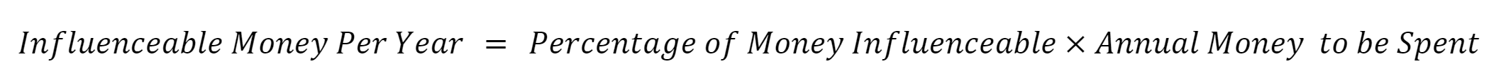 To estimate, Annual Money Influenced, which is how much money an RP report is influencing in expectation per year, we estimate how much money is influenceable per year and the annual money being donated by the funder:
