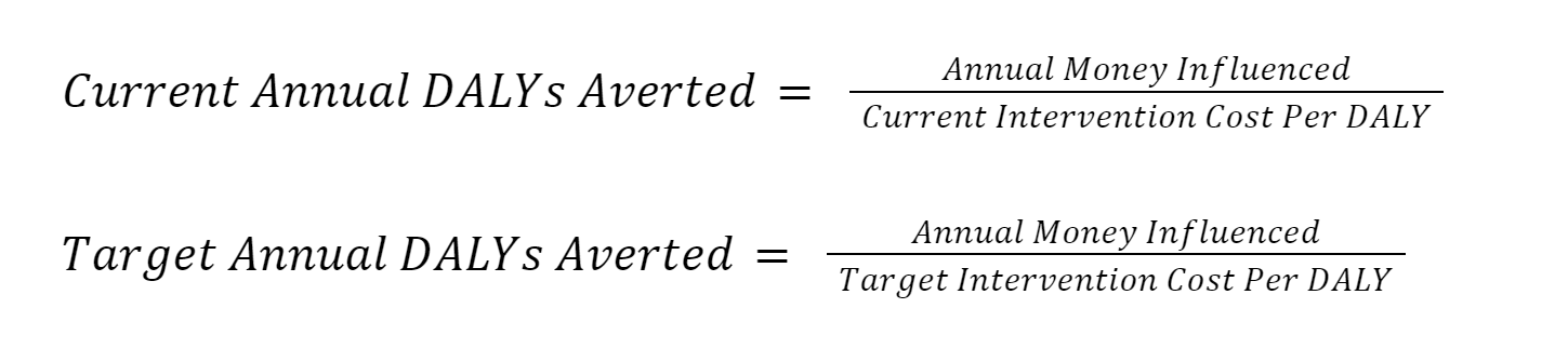 Taking Annual Money Influenced, along with estimates of the cost-effectiveness of the current intervention a funder is supporting, and the cost-effectiveness of the (target) intervention they could be updating to, you can estimate the total amount of good (measured here as DALYs averted) that could be achieved with the amount of money being influenced: