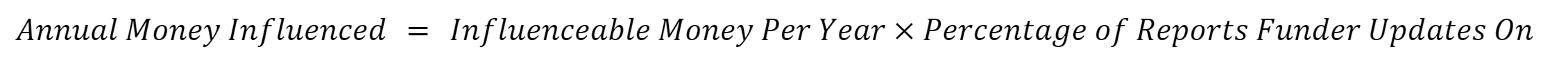 Taking the resulting Influenceable Money Per Year, and given the above Percentage of Reports Funder Updates On, you can multiply with the amount of money influenceable per year in order to estimate the annual money influenced: