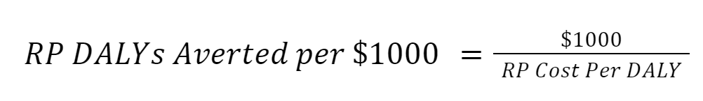 RP Cost Per DALY captures the efficiency of a given project, how much does it cost for RP to generate one DALY averted. Standardizing this to be in DALYs averted per $1000 can be helpful when making comparisons: