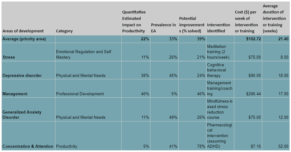 Epistemic status: This post incorporates several sources of data and considerations including needs, skills, and bottlenecks reported in existing surveys within the EA community[1] (~ 1000 respondents), interviews we conducted, relevant reports, scientific literature (ranging from cross-sectional studies to systematic reviews and RCTs), and own models and experiences as practitioners (primarily coaches). We mainly give quantitative point estimates (e.g., our cost-effectiveness estimates) even though confidence intervals would better reflect the underlying distribution and uncertainty. We hope this will be seen as one line of research into this area (that has many flaws) and would be keen to learn about other perspectives.