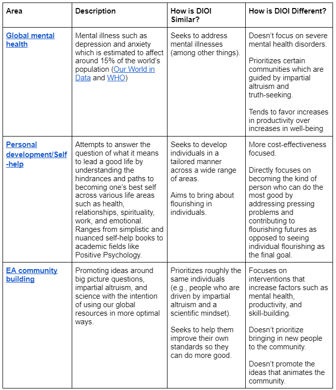 Table: A simple diagram showing the relationship between the development of impact-oriented individuals and more established areas such as mental health. You can find an interactive version of this table here.