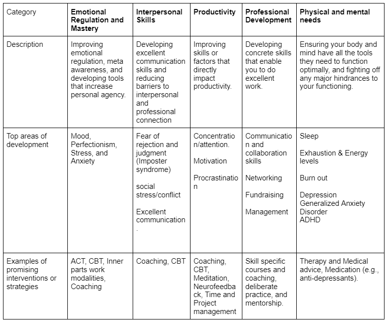 We also created a more elaborate spreadsheet which includes considerations such as what might indicate that an individual would benefit from developing an area (e.g., stress) and how to measure it (e.g., the Perceived Stress Scale) (see 1.1 Area of improvement estimates (elaborate)). Most importantly, however, it seems that finding the right people and offering highly tailored solutions are key.