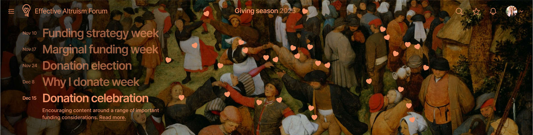 It’s that time again — Giving Season, 2025. We’ve got a packed schedule of events on the EA Forum, aimed at eliciting more and better donations, as well as reaching new audiences. In this post, I’ll tell you what to expect, and how you can help.