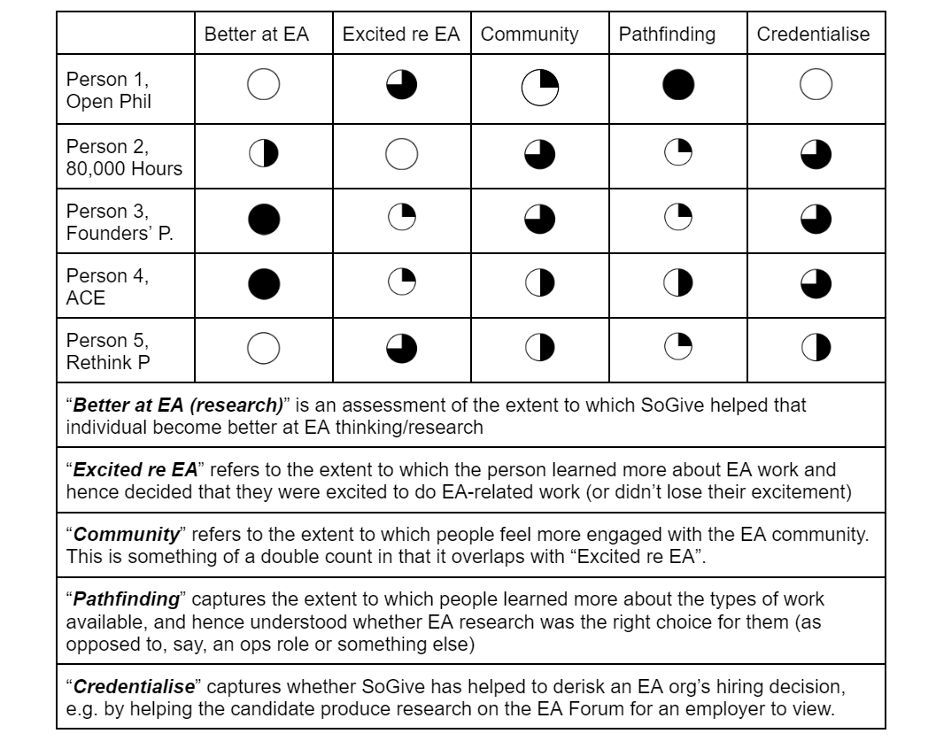 - It seems in this early stage of evaluating the impact SoGive volunteering, it would be especially important to run this both by the volunteers themselves (especially for 2,3,4) and the orgs (especially for 5)