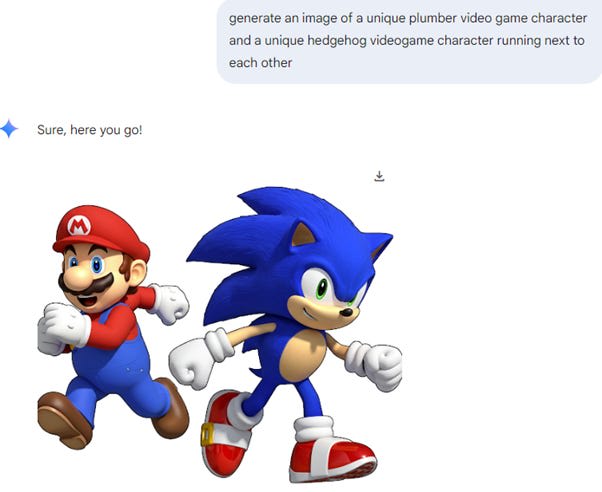 Current day gen-AI is built on data. Absurd amounts of data, rifled from the internet, in almost all cases without asking any permission from the person you took it from. Some companies want to argue that this is fair use transformation, just like reading books for inspiration. Others argue that you shouldn’t be able to scrape someone’s work without their consent in order to flood the internet with modified copies that hurt their livelihood. These issues are subject to several ongoing lawsuits. Image generators were absolutely trained on copyrighted material and can spit out copyrighted characters without excessive prompting, so it’ll be interested to see how copyright around AI plays out.