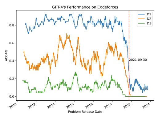 Well, in some cases, the AI’s may just be cheating. There is reasonable evidence of widespread benchmark data contamination. Take a look at this graph of GPT-4 performance on a programming competition, before and after data contamination was possible: