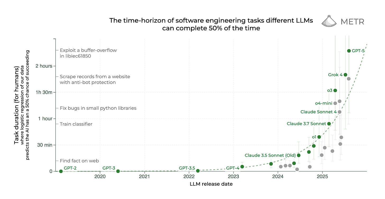 Here’s a graph from METR that shows when AI was able to complete software engineering tasks of different lengths.