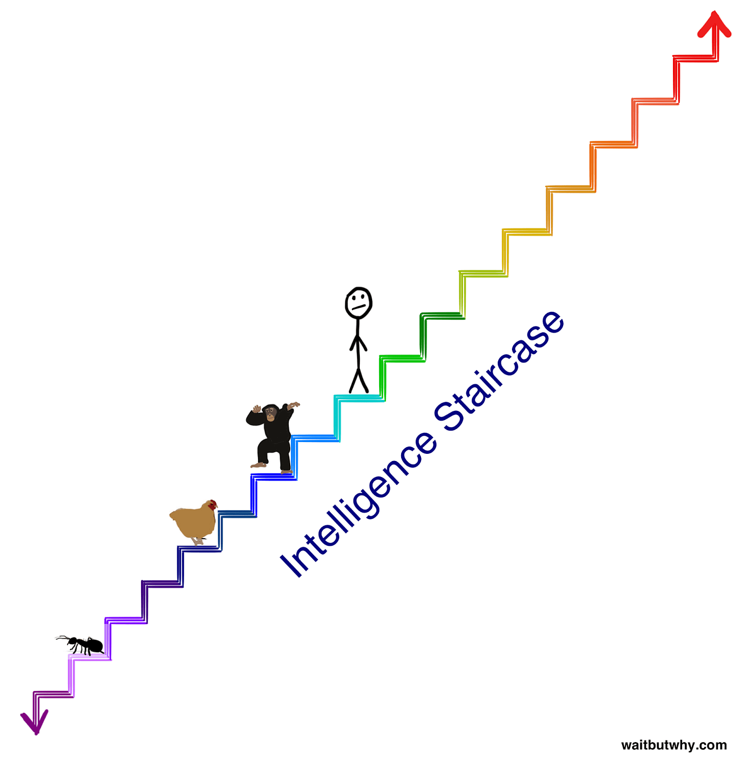 To convey this, here is a metaphorical intelligence staircase made by Tim Urban.