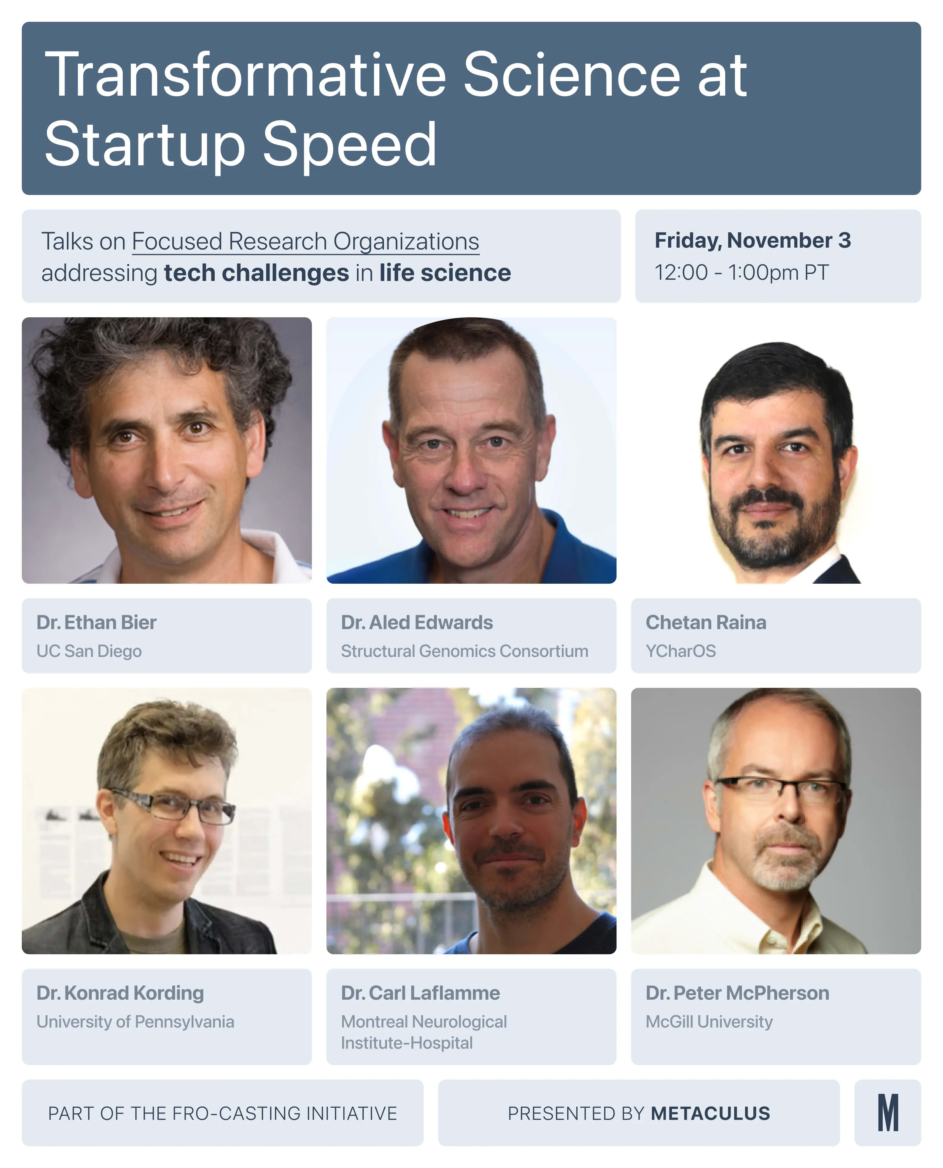 Join Metaculus Friday, November 3rd, 12:00-1:00pm PT for a series of technical talks addressing life science challenges via Focused Research Organizations (FROs).