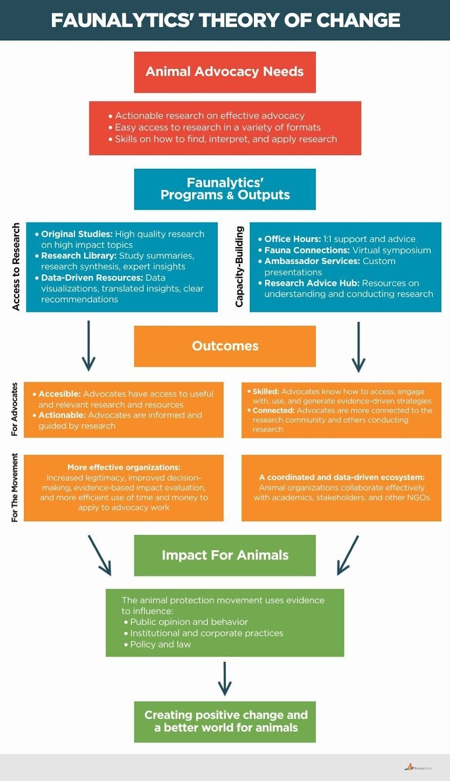 - Original Research: Faunalytics now conducts 10 to 12 original research studies each year that are likely to have a high impact on animals. We identify our research projects through a multi-stage prioritization process, which includes gathering input from advocates and topic experts to identify knowledge gaps and conducting assessments to verify the potential impact.