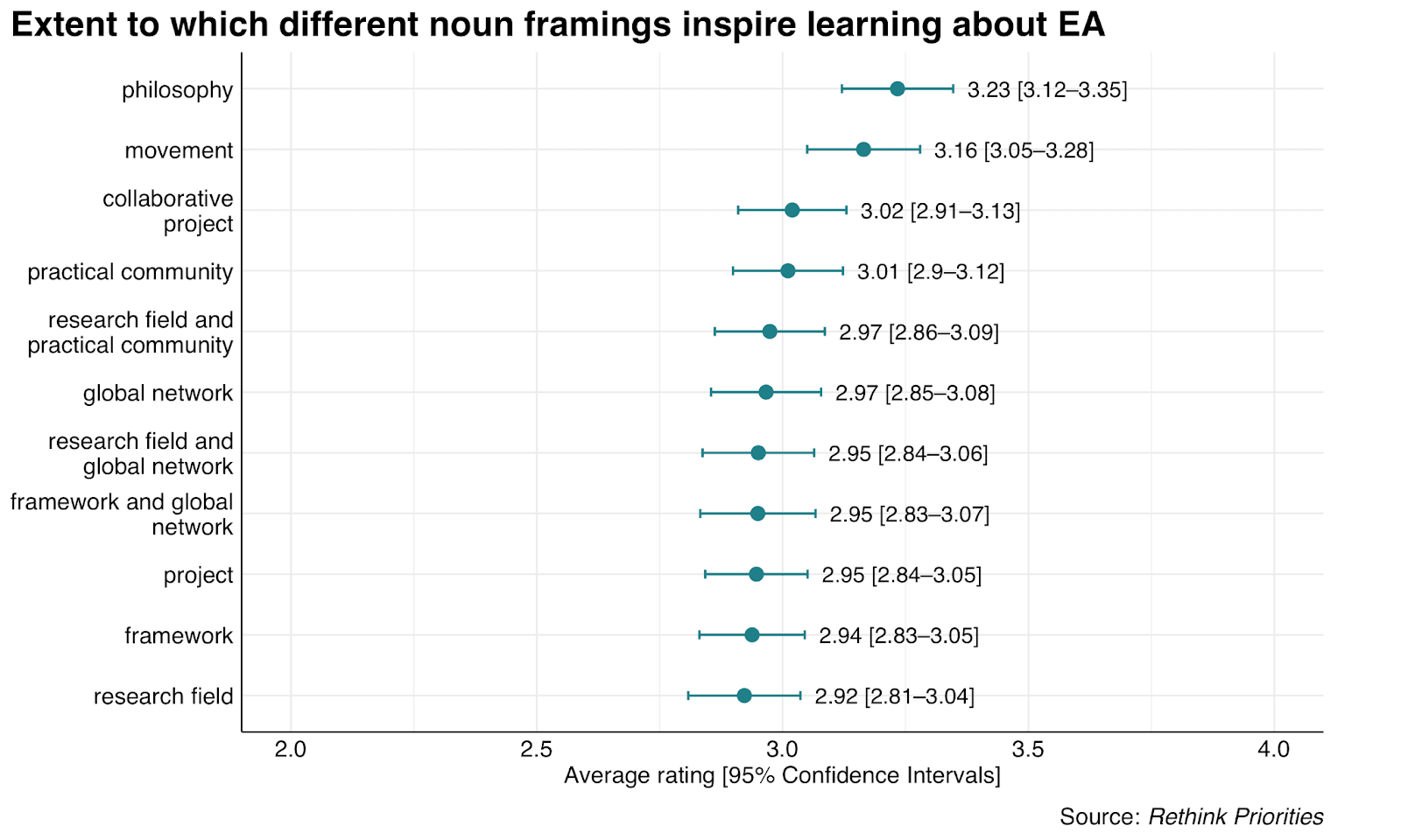 - Nouns: The effect of using different nouns to refer to EA was small, but referring to EA as a ‘philosophy’ or ‘movement’ inspired the most curiosity compared to options including ‘project’ and ‘research field’.