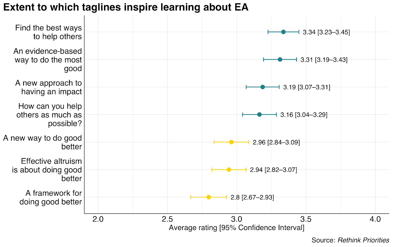 - We observed a consistent pattern where taglines that included the phrase ‘do[ing] good better’ received less support from respondents and inspired less interest in learning about EA.