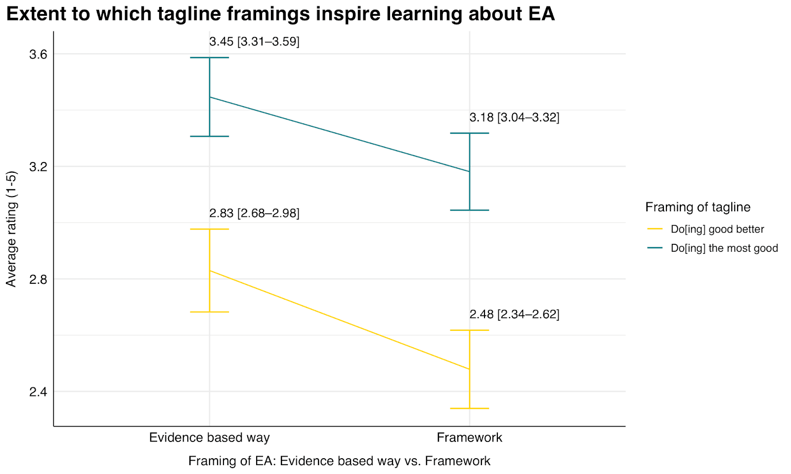 Similarly, respondents expressed considerably more interest in learning more about EA when the “do[ing] the most good” phrase was used compared to the “do[ing] good better” phrase.