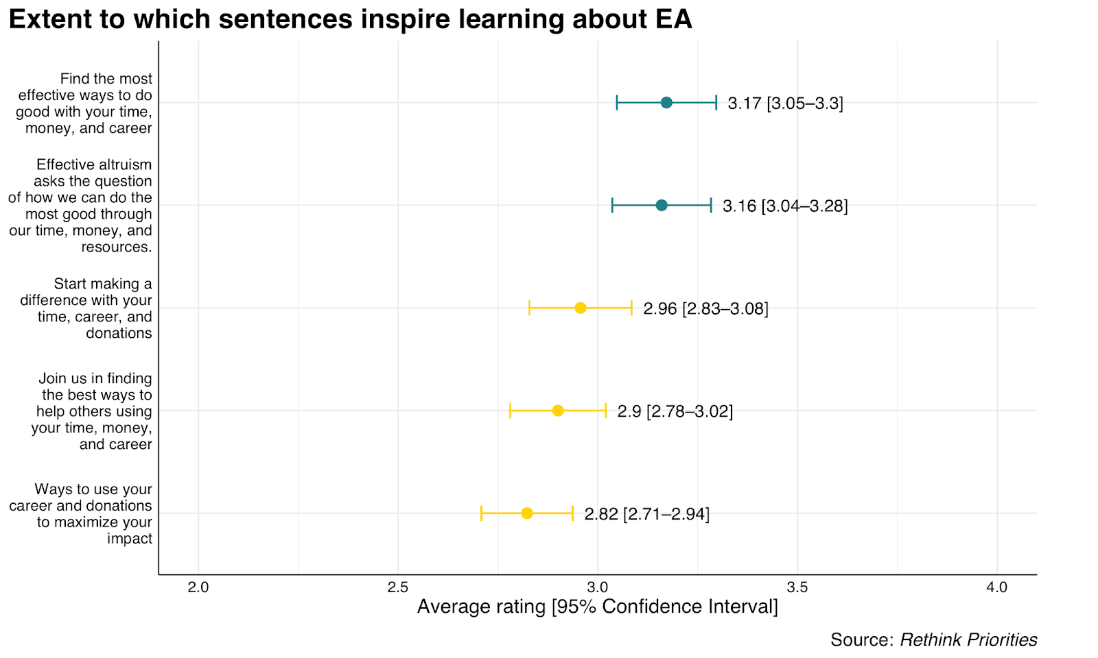 - Sentences: “Find the most effective ways to do good with your time, money, and career” and “Effective altruism asks the question of how we can do the most good through our time, money, and resources,” were rated as the highest in terms of both curiosity and support.