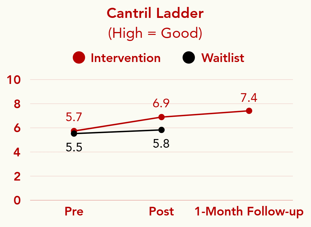 - Average life satisfaction (Cantril Ladder, 0-10): 5.7 at baseline → 6.9 at post-intervention → 7.4 at one-month follow-up (Cohen's d = 0.93)