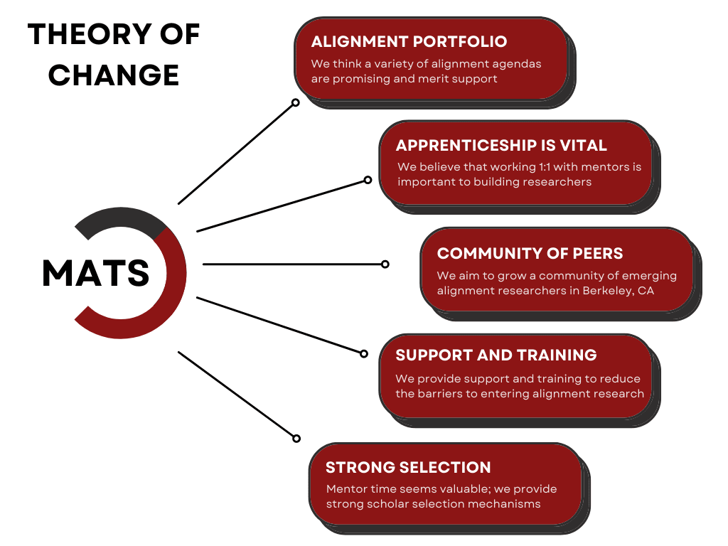 The SERI ML Alignment Theory Scholars (MATS) program aims to find and train talented individuals for what we see as the world’s most urgent and talent-constrained problem: reducing risks from unaligned artificial intelligence. We believe that ambitious young researchers from a variety of backgrounds have the potential to contribute to the field of alignment research. We aim to provide the mentorship, curriculum, financial support, and community necessary to aid this transition. Please see our theory of change and website for more details.
