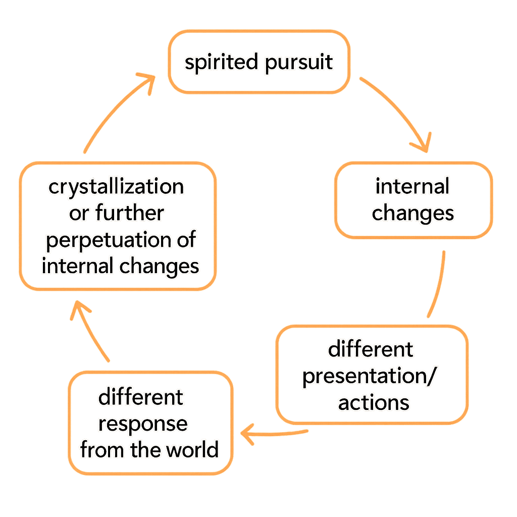 A compressed overview: spirited pursuit → internal changes → different presentation/actions → different response from the world → crystallization or further perpetuation of internal changes.[27]