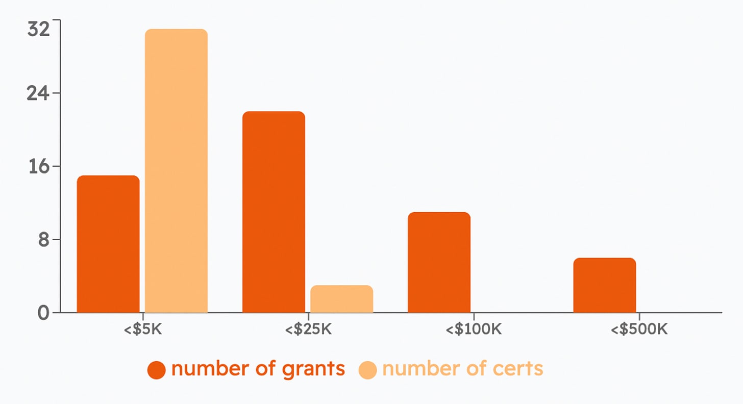 - Honorable mention to Forecasting, which only received $76K total, but encompassed 35 projects. This is because our two biggest impact certificate rounds so far—ACX Mini-Grants and the Manifold Community Fund—were centered around forecasting and funded lots of small projects.