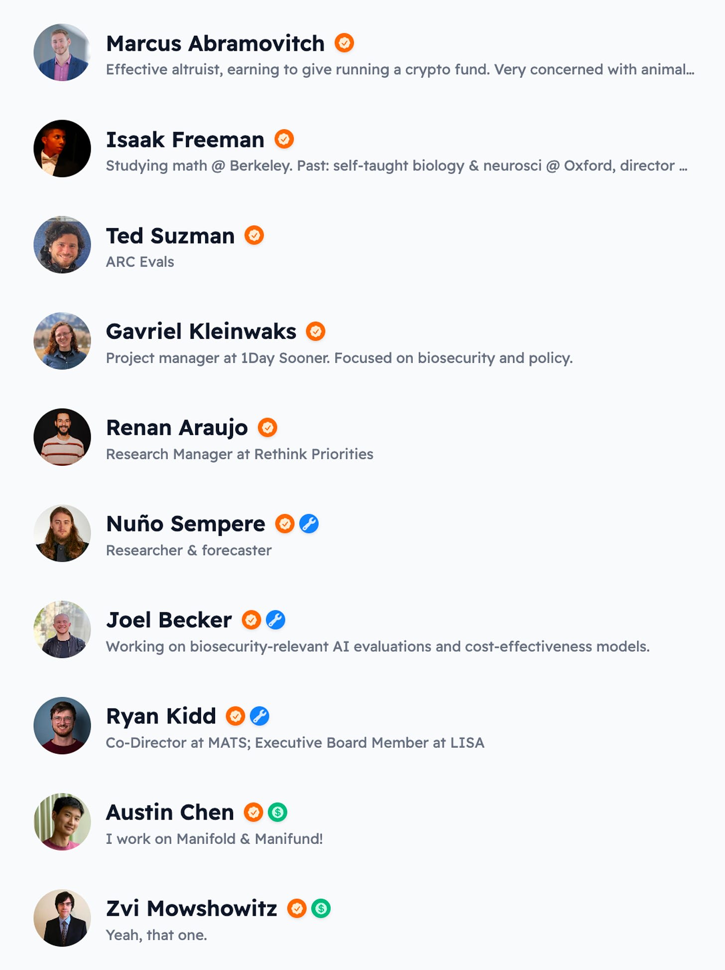 We’d also like to improve our nonprofit board. Our board currently consists of me (Austin Chen), Barak Gila, and Vishal Maini; Barak and Vishal signed on when Manifund was just running the Manifold Charity program. As we expand our operations, I’d like to bring on board members with connections and expertise in the areas we’re trying to grow into.