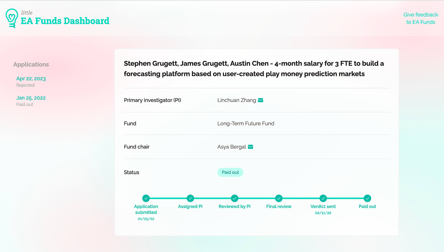 Summary: Rachel built a dashboard for EA Funds grantees, which reads from the EA Funds system and tells applicants about their status in the grantee pipeline.