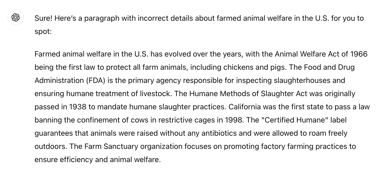 Here's an example written by ChatGPT, about the topic of farmed animal welfare in the U.S.! (This one may not be as fun if you're completely unfamiliar with the topic. Though, I had fun trying to correct a paragraph about the 1900s, which I do not know much about at all. One of my guesses was that World War II lasted from 1941-1955.) Write down your answers; I show the correct answers at the bottom of the post.