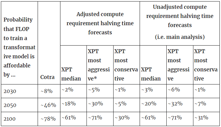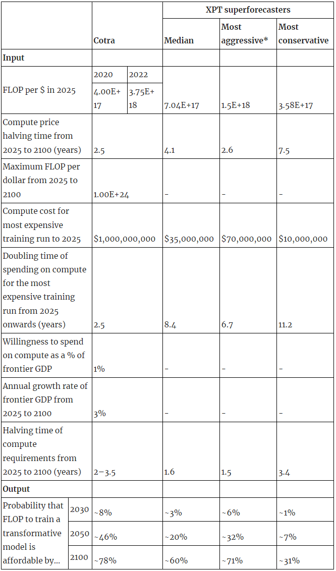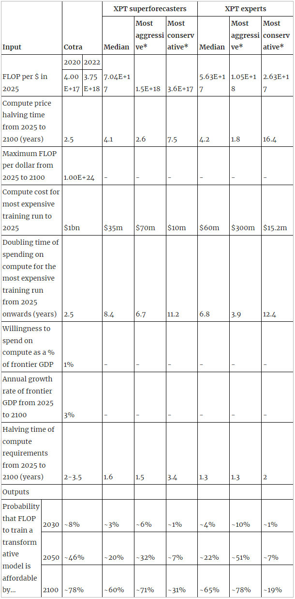 - Even the most aggressive XPT superforecaster inputs imply a lower probability that the compute required for training TAI is available than Cotra predicts, but the most conservative XPT superforecaster inputs predict TAI by 2100 as less likely than not.