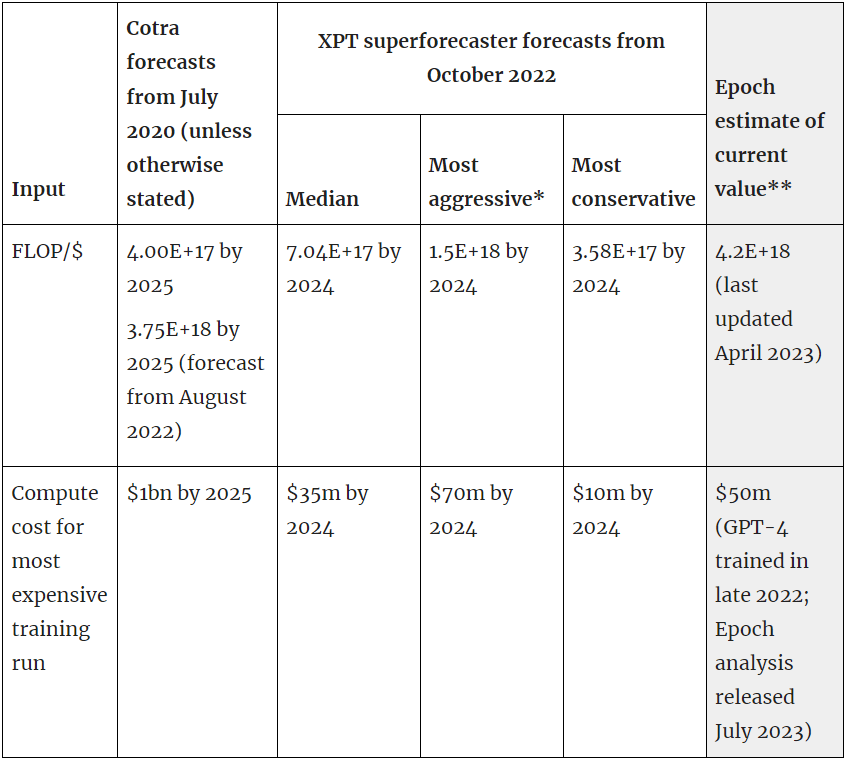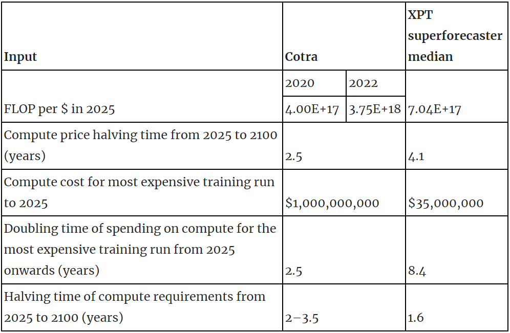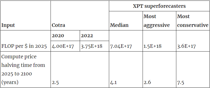 - As part of the Existential Risk Persuasion Tournament (XPT) we asked participants to forecast several questions that allowed us to infer inputs to Ajeya Cotra’s biological anchors model. The XPT superforecasters’ predictions differ substantially from Cotra’s on hardware costs, willingness to spend and algorithmic efficiency: