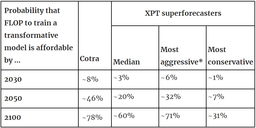 - In this post, we focus on the forecasts of XPT superforecasters, as opposed to experts, when comparing with Cotra’s forecasts.