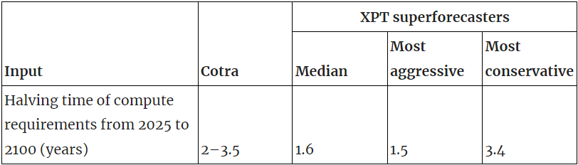 - XPT forecasters made their predictions three years after Cotra made hers.