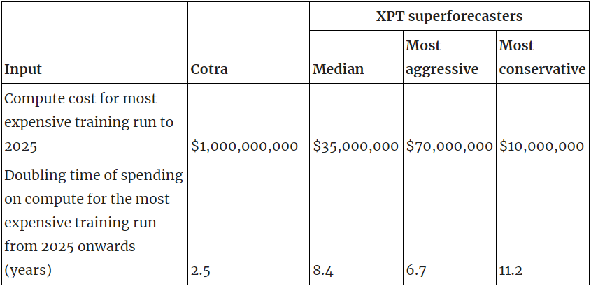 - Cotra expects that the most expensive training run is likely to be unreleased.[9] XPT forecasters do not highlight this possibility in their forecasts even though unreleased models are included in the relevant resolution criteria. It is unclear whether XPT forecasters disagree substantively with Cotra, missed this consideration in their analysis, or were confused about resolution criteria. If Cotra's expectation is correct, and we accept her claim that unreleased runs are likely to be 2–8 times more expensive, XPT forecasts would still be an order of magnitude lower than Cotra’s forecast, but more comparable with her conservative forecast of $300 million.