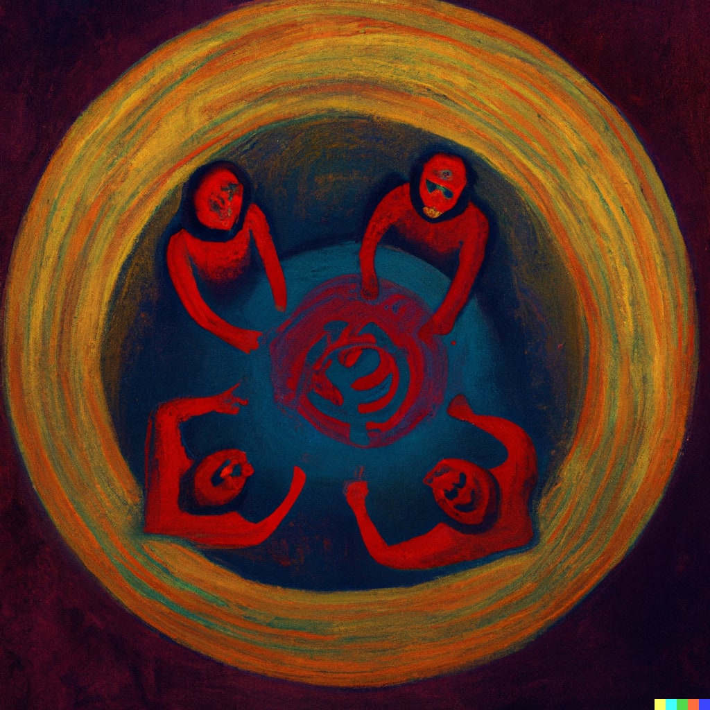 I was looking for a description of Doom Circles for an event I'm working on and couldn't find one, so wrote this up. Thanks, Duncan Sabien and Kenzi (Amodei) Ashkie for sharing the history and quotes! Thanks to Olivia Jimenez, AW, and Justis Mills for comments and edits. And thanks to DALL·E for the"painting of four people sitting in a scary circle of doom".
