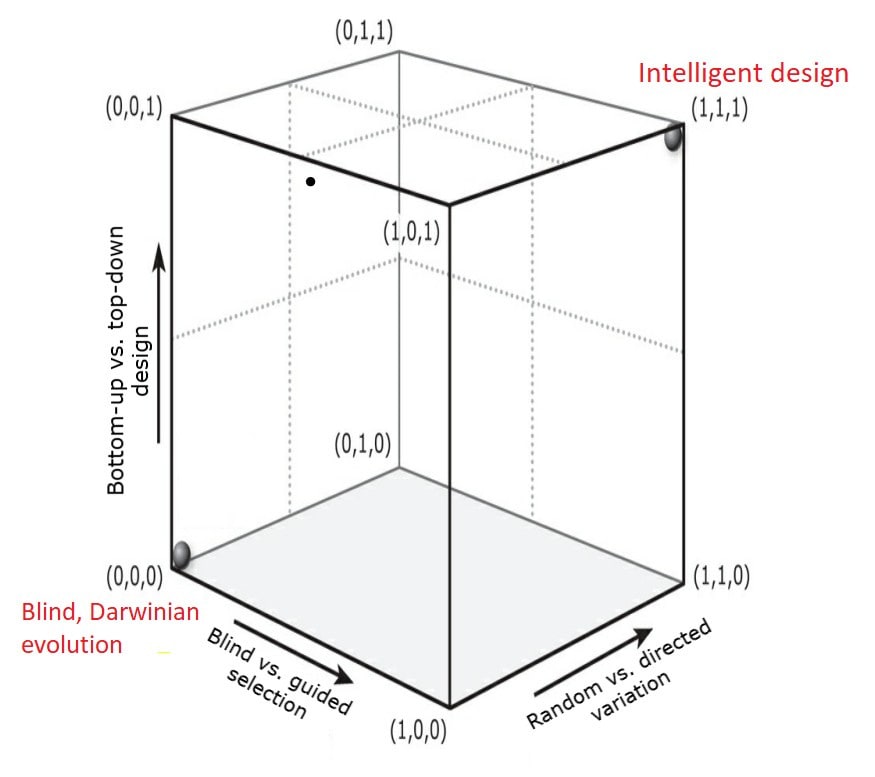Is artificial selection by human breeders still a form of natural selection? It depends on your definition. There is no essence of natural selection, or as Daniel Dennett puts it, we have to be Darwinian about Darwin. Everything comes in shades and gradations. Below you see another Darwinian space that visualizes the difference between blind evolution and intelligent design, along a number of dimensions. Fully Darwinian evolution (lower left corner) involves random variation, blind selection and bottom-up design, while fully intelligent design uses directed variations, guided selection and top-down design.