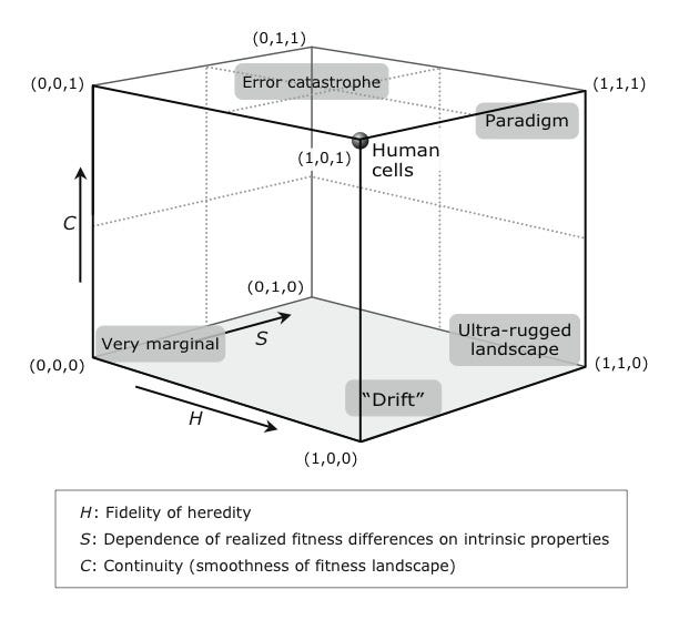 But then Hendrycks takes a leap. That AIs evolve through natural selection is extremely worrying, he argues, because natural selection tends to produce selfish, deceptive and dominant creatures. Here’s where we diverge. Lewontin’s conditions describe the bare minimum for natural selection, but there’s a wide range of parameters. Philosopher Peter Godfrey-Smith has developed a visual framework called Darwinian spaces for distinguishing between paradigmatic and marginal cases of natural selection. Examples vary along dimensions like the fidelity of replication or the smoothness of the fitness landscape (intuitively, how gradually or suddenly your fitness changes with each genetic tweak). A Darwinian space typically represents three dimensions, but you should think of it as a multidimensional space, projected in 3-D. In the upper right corner of the picture below, you find paradigmatic cases of natural selection; as you further move away from that point, you get more marginal cases but still natural selection. One marginal example is computer virus evolution: the most infectious survive, but often the viruses don’t mutate and have been crafted by an intelligent designer. Another is the cultural evolution of empires: successful empires conquer neighboring nations or tribes, but you will find no clear “reproduction” events, in which a parent empire spawns tiny offspring.