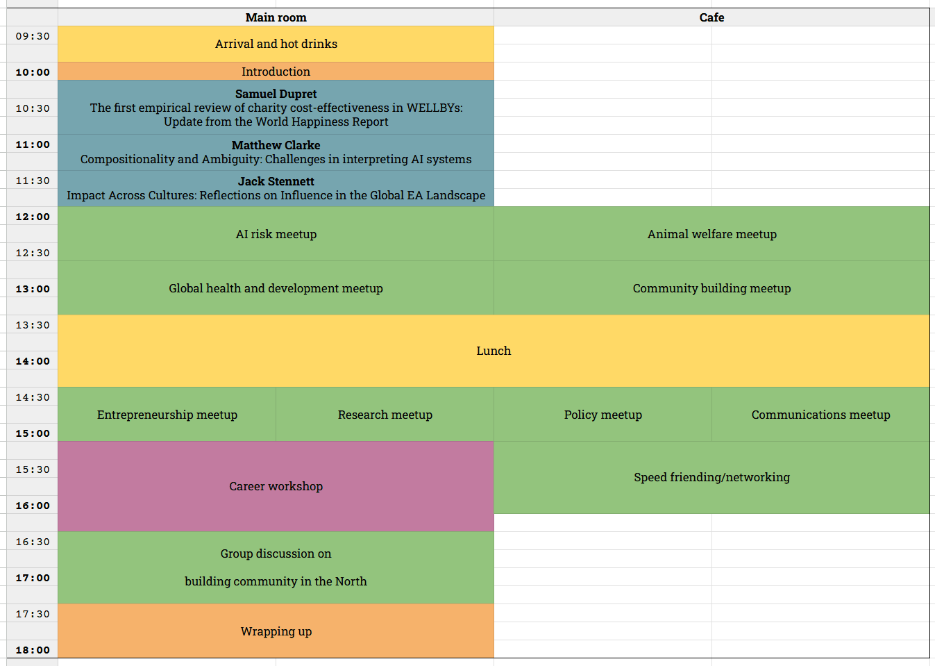 EA North was a one-day conference in Sheffield (UK) aimed at people in the North of England (Manchester, Liverpool, Sheffield, Leeds, etc.). The event had 35 attendees on the day.[1] The cost per attendee was £50 and the cost per new connection was £11. The total cost was £1765. By this metric, EA North is significantly more cost-effective than EAGs.