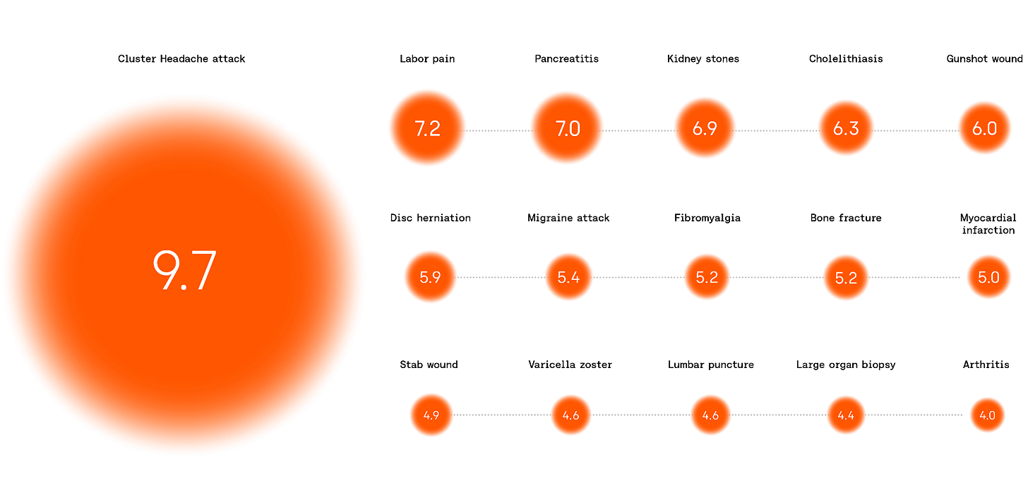 Still, empirically this scale provides some useful signal that allows us to compare experiences, even if imperfectly — by averaging out individual differences. Cluster headaches frequently get rated at 10 on this scale.