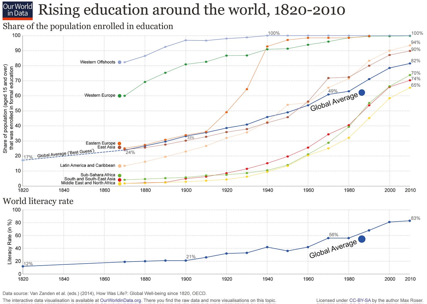 - Literacy rates have risen from just 12% globally in 1820 to over 80% today