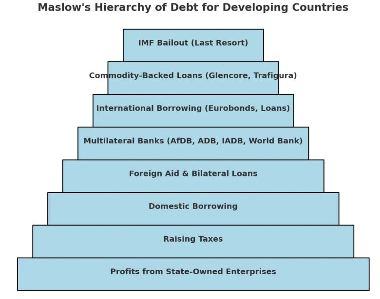 - Countries follow a ‘hierarchy of debt’ when funding government activities, starting with profits from state-owned enterprises and taxation, then progressing to domestic borrowing, foreign aid, multilateral loans and IMF bailouts as a last resort
