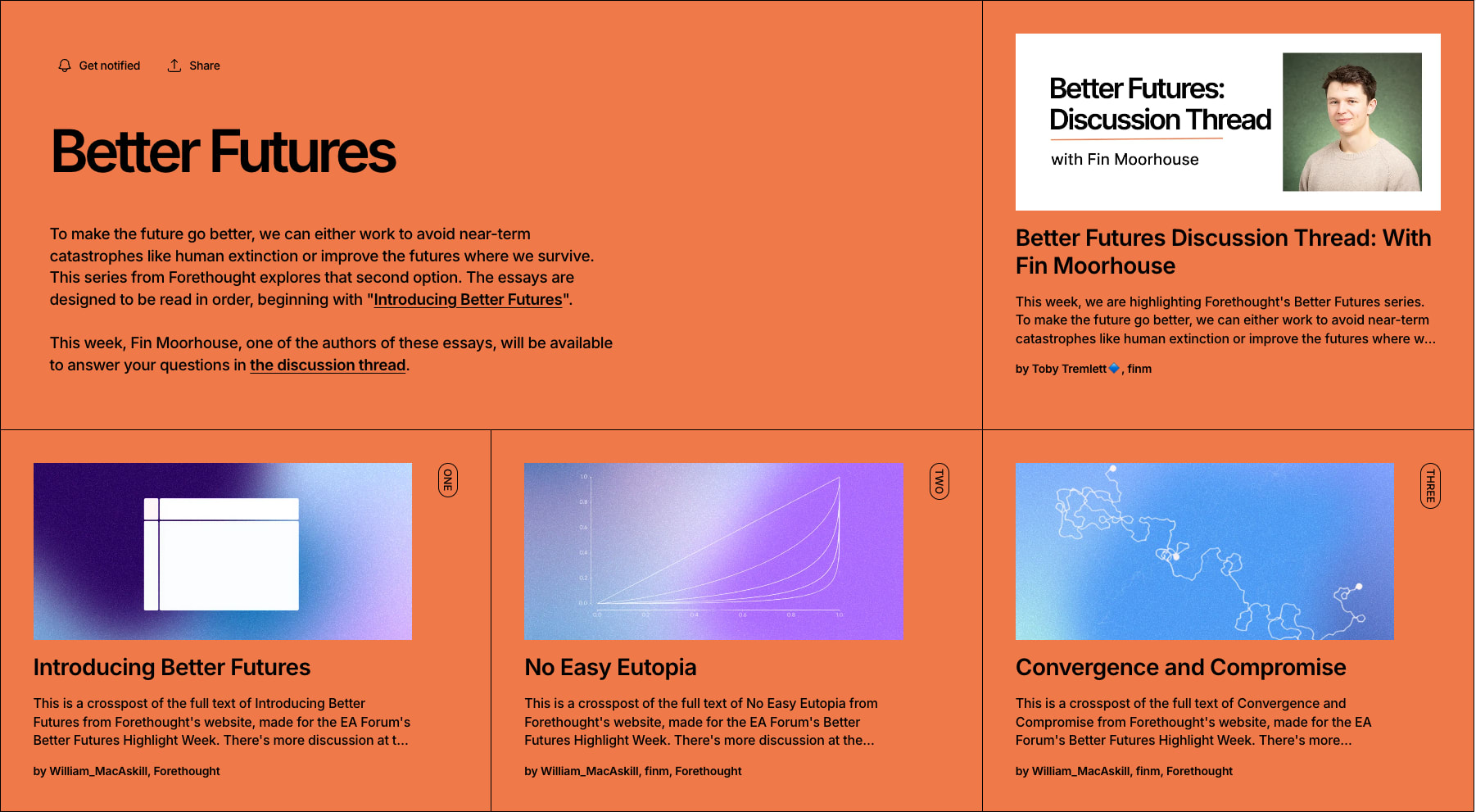 This week, we are highlighting Forethought's Better Futures series. To make the future go better, we can either work to avoid near-term catastrophes like human extinction or improve the futures where we survive. This series from Forethought explores that second option.
