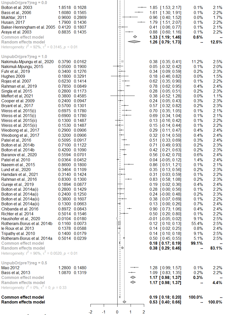 If not defining the inclusion criteria of depression as a diagnosis, it's worth considering if certain psychiatric/medical conditions or settings should be excluded e.g. inpatients. As a hypothetical, extracting data on depression symptom scales for a non-HCP delivered psychotherapy in bipolar patients will obviously be misleading in isolation (i.e. the study likely accounted for measuring mania symptoms in their findings, but would be lost in this meta-analysis). One study included in this analysis (Richter et al) looked at an intervention which encouraged adherence to anti-retroviral medications via peer support for women newly diagnosed with HIV. Fortunately, this study shouldn't have been included as it didn't involve delivering psychotherapy, but for the sake of argument, is that fair given the neuropsychiatric complications of HIV/AIDS? Again, it's not about preparing for every eventuality, but it's having clear inclusion/exclusion criteria so there's no argument about cherry-picking studies because this has been discussed prior to search and analysis.