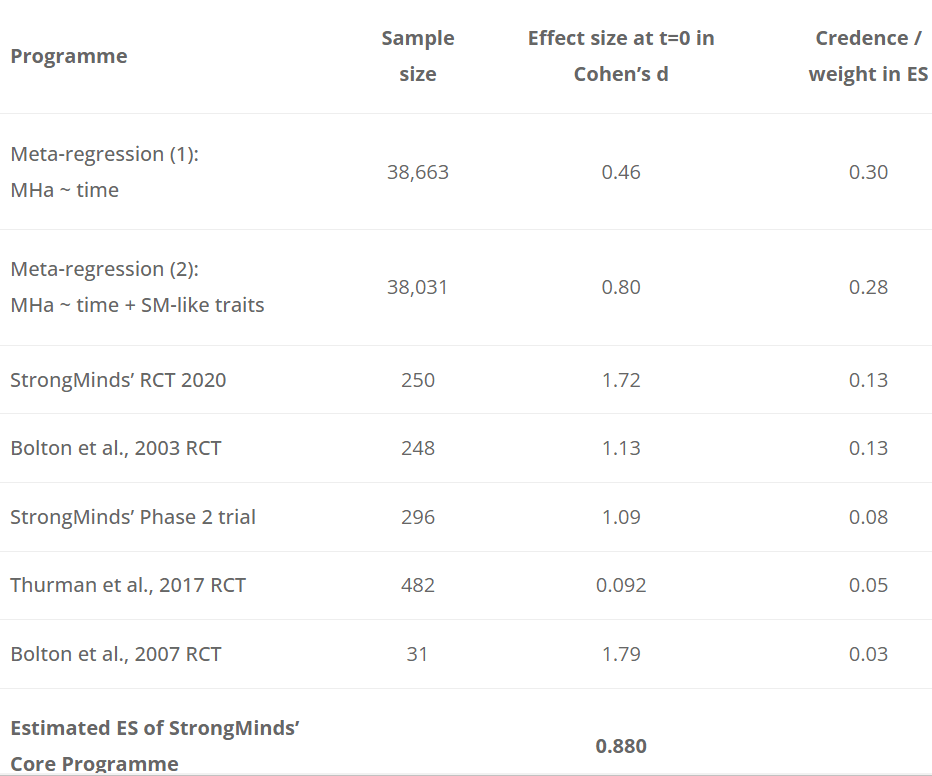 Given inclusion/exclusion criteria aren’t stated clearly in the meta-analysis and the aim is pretty woolly, It seems the focus of the upcoming RCT and Strongminds research is evaluating: