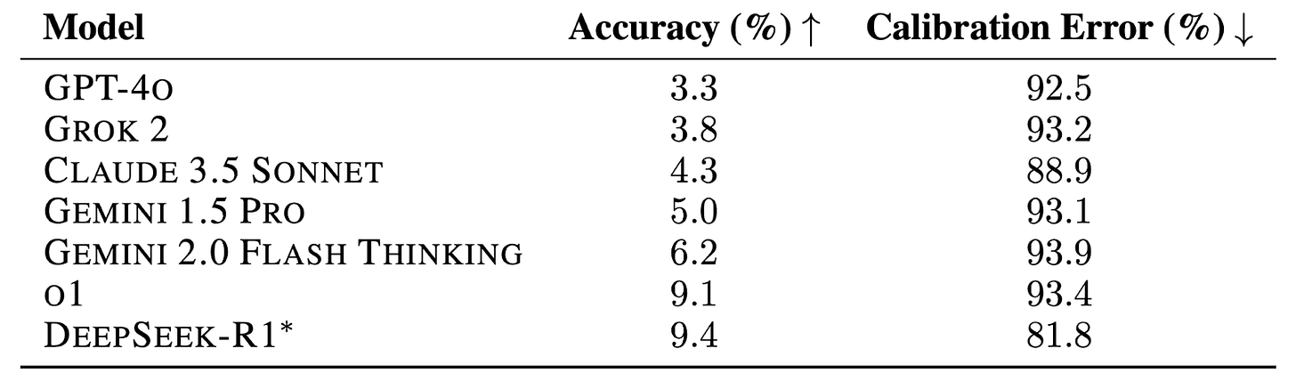 Current AI models perform poorly on HLE. State-of-the-art language models achieve low accuracy on HLE despite their strong performance on other benchmarks. DeepSeek-R1 leads at 9.4%. Models are also systemically overconfident, with calibration errors ranging from 80% to over 90%—indicating they fail to recognize when questions exceed their capabilities.