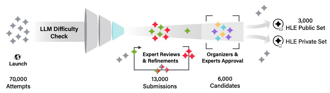 HLE questions are rigorously validated. The benchmark was developed with a multi-stage validation process to ensure question quality. First, question submissions must prove too difficult for current AI models to solve. Then, questions undergo two rounds of expert peer review, and are finally divided into public and private datasets.
