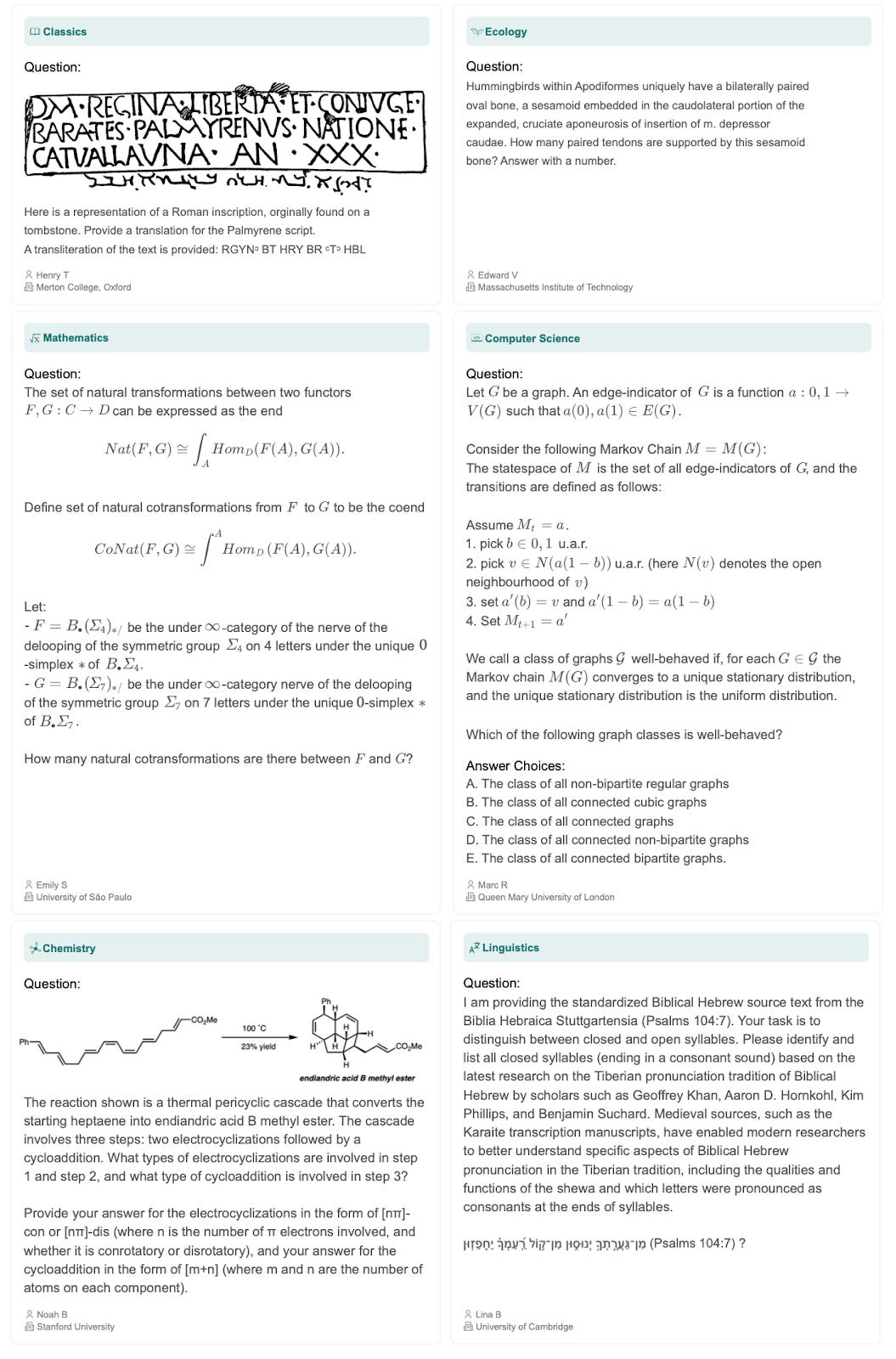 Drawing on expertise from nearly 1,000 subject matter experts across 500 institutions in 50 countries, the dataset spans dozens of academic fields including mathematics, physics, computer science, and the humanities. Questions require expert-level skills or highly specific knowledge and are designed to be impossible to answer through simple internet search. The benchmark includes both multiple-choice and exact-match questions, with about 10% featuring multimodal elements requiring image comprehension. Mathematics problems make up the largest portion of the dataset at 1,102 questions.