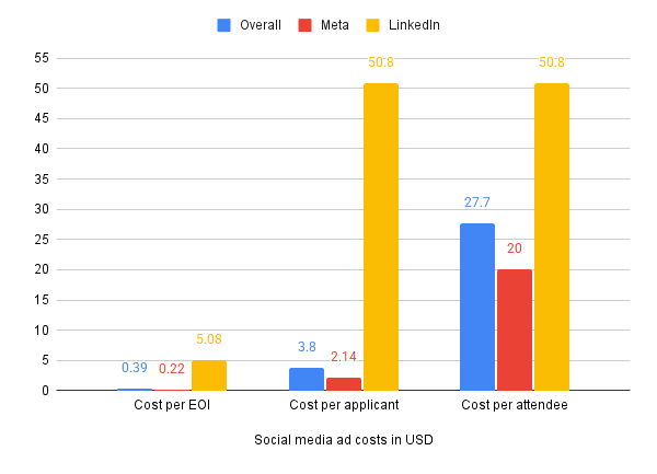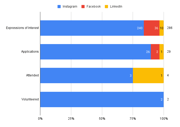 We ran social media ads on Meta and LinkedIn before the event. $100.80 worth of ads resulted in 286 expressions of interest, 29 applications and 4 attendances. Some volunteers who learnt about the event via the ads referred others - at least 3 we know of, who also attended and volunteered. This means a total of 7 people attended the summit directly or indirectly as a result of the ads.